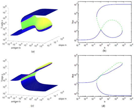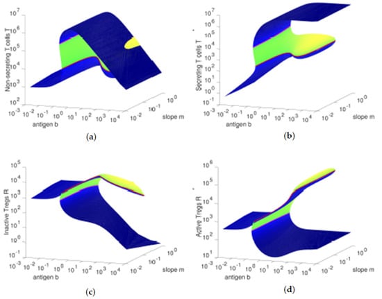 We observe in Figure 1 that the concentration of Tregs y is lower when the concentration of T cells x decreases towards and when the concentration of T cells x increases toward . In Figure 2, we can verify that, for high values of the antigenic stimulation b of T cells, the concentration of T cells x is high and the concentration of Tregs y is low, corresponding to an immune response state of the T cells. The controlled state of the T cells is present for low values of the antigenic stimulation b of T cells, being characterized by low values of the concentration of T cells x and concentrations of Tregs y close to their homeostatic values . For intermediate values of the antigenic stimulation b of T cells, we can observe a bistability region, with one equilibria presenting high concentrations of Tregs y and intermediate concentrations of T cells x and the other equilibria being an immune response state. In Figure 3, we observe that, for higher values of the antigenic stimulation b of T cells, the concentration of inactive Tregs R is higher (and the concentration of active Tregs is lower) for lower values of the slope parameter, due to the lower antigenic stimulation of Tregs. As we increase the antigenic stimulation b of T cells from lower values to higher values, initially we observe an increase in the concentrations of the four cell types, which is supported by the increasing concentrations of secreting T cells and the correspondent increase of IL-2 cytokines (data not shown).