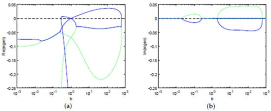Relation between the eigenvalues () with the largest real part (blue line) and the second largest real part (green dashes) with the antigenic stimulation b of T cells, for . (a) the largest real part of the eigenvalues can be positive for b between and ; and that the second largest real part of the eigenvalues is negative. (b) the two shown eigenvalues can be complex conjugate for b between ∼ and ∼, and for b between ∼ and ∼.