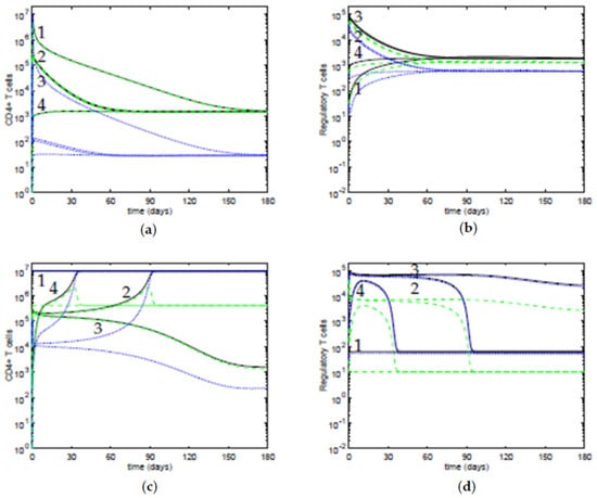 In Figure 5a,b, the value of the antigenic stimulation of T cells is low, , and the slope parameter is ; the other parameters are at the default values in Table 1. For these values of the parameters, there is only one stable steady state, a controlled state of the T cells, and the four initial conditions approach it. In Figure 5c,d, the value of the antigenic stimulation of T cells is and the slope parameter is ; the other parameters are at their default values. For these values of the parameters, there are two stable steady states: an immune response state of the T cells and a controlled state of the T cells. We observe that the initial conditions 1, 2, and 4 approach an immune response steady state; and the initial condition 3 approaches a controlled steady state, with low concentrations of T cells. Moreover, although the initial conditions 2 and 3 are close, their time evolutions diverge from each other, indicating that they belong to distinct basins of attraction of the equilibria. For the initial condition 4, although it starts with a low concentration of T cells, the inhibition by the active Tregs is insufficient to maintain the T cells controlled, thus the system approaches the immune response steady state, after a transient period. Regarding the time dynamics, when the values of the antigenic stimulation of T cells b are such that the eigenvalues have a negative real part and a nonzero imaginary part, the trajectories in the neighborhood of the equilibria approach it in a spiraling trajectory in the direction of the plane determined by the corresponding eigenvectors, and the time dynamics can have damped oscillations. In particular, this behavior can be observed near the controlled equilibria, for values of the concentration of T cells , and for values of antigenic stimulation of T cells b between ∼ and ∼, and for b between ∼ and ∼, though with periods of oscillations larger than 100 days, and with a marked decay of the amplitude in each period (data not shown).