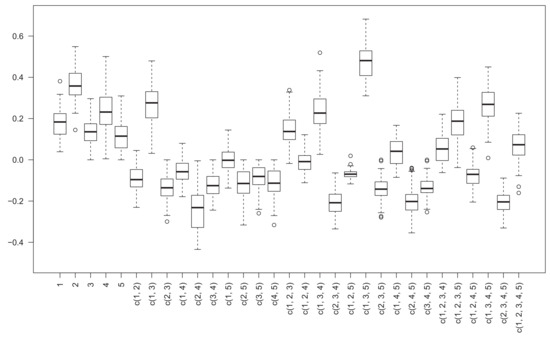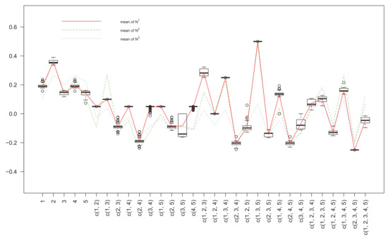 Figure 1 for the purpose of comparison, where for the horizontal axis “c(1, 2)” means the coalition of decision criteria 1 and 2, i.e., {1, 2}. Taking nonadditivity index