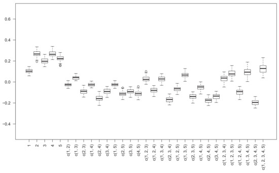 the nonadditivity interaction index of belongs to [0.5, 0.75], the nonadditivity indices of and belong to [0.25, 0.5], the nonadditivity indices of , , , and belong to [0, 0.25], the nonadditivity indices of , , , , and belong to [−0.25, 0], and the nonadditivity index of belongs to [−0.5, −0.25].