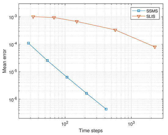 In the Figure 3, we see the differences in the convergence behaviour between the shifted Strang–Marchuk splitting (SSML) and the shifted linear iterative splitting (SLIS) method. We see in the figure, that the SSML method has only a linear convergence order , the SLIS method has higher order of convergence, here we have at least an order . Therefore the adaptive iterative scheme is much more effective and accurate than the noniterative splitting scheme. The result verified the proposition, that the iterative splitting scheme is a higher order scheme, see [3,15], and that we also conserve the higher order approach in the adaptive version.