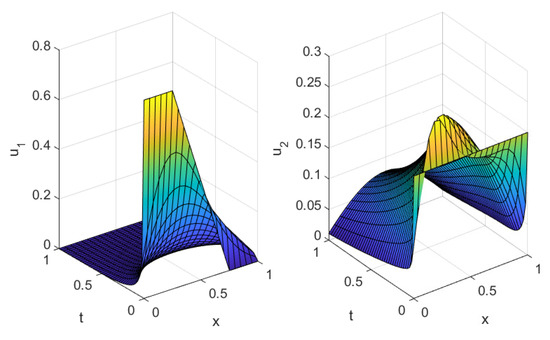 Figure 4 illustrates the uphill phenomenon, where the solutions and increase before reaching the stationary state.