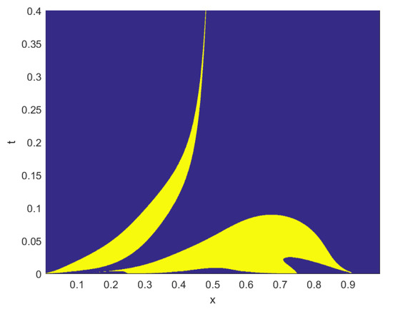 Figure 5 depicts the regions in the space-time plane where the uphill phenomenon takes place, that is where and have the same sign. The equation is solved by the shifted linear iterative splitting with .