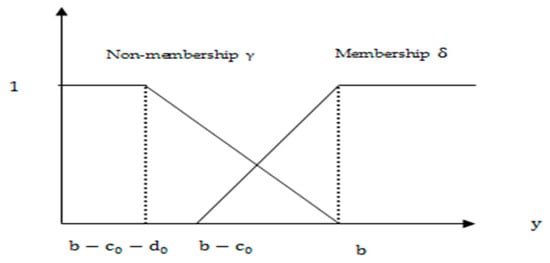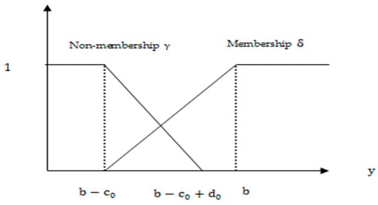 Aggarwal et al. [22] discussed the inequality relations of IFSs in the optimistic and pessimistic sense. Suppose and let , then the I-fuzzy sentence to be read as “ is greater than or equal to with tolerances and ”, and is represented in terms of the following membership function: