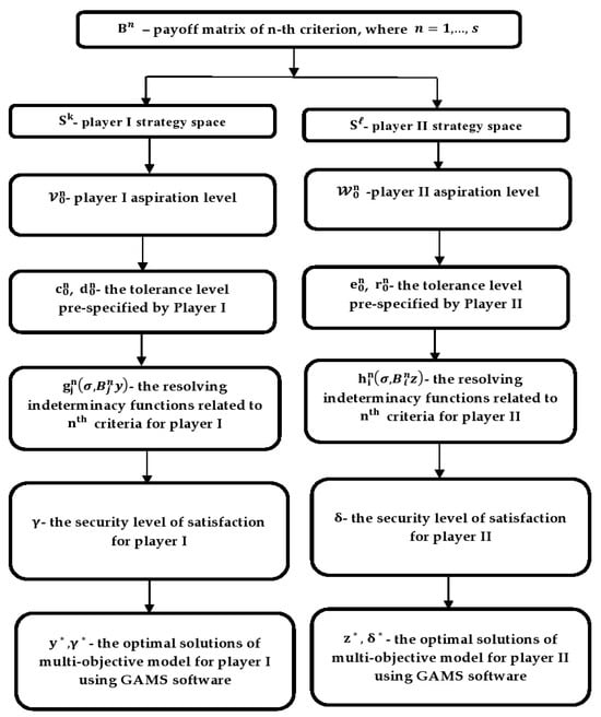 Real-life problems usually entail imprecision and uncertainty in the decision-making process. Therefore, linguistic set, fuzzy set, and IFS are frequently applied to express uncertain and imprecise parameters appearing in decision making problems. The IFS helps to describe situations requiring negation, affirmation, and hesitation simultaneously. Thus, the IFS represent more information than the fuzzy set. In this article, we study multi-criteria zero-sum matrix games with IFSs goals in which the goals of players are represented with IFSs, and payoffs of both players are real numbers. As demonstrated by Aggarwal et al. [41], the multi-criteria matrix game with IFSs goals differs from the multi-criteria matrix game with fuzzy set goals. The IFSs use the membership degree and the non-membership degree to represent the goals of both players, while the fuzzy set uses only the membership degree to represent the goals of both players. Thus, the hesitation degree of the IFS goals is not equal to zero, while the hesitation degree of the fuzzy set goals is always equal to zero. Consequently, the conventional approaches and models of fuzzy multi criteria matrix games cannot be used directly to solve multi criteria matrix games with I-fuzzy goals. Thus, this article proposes a resolving indeterminacy approach to solve multi criteria matrix games with I-fuzzy goals. An I-fuzzy multi-objective linear programming problem is constructed to obtain the Pareto optimal security strategies of any multi criteria matrix game with I-fuzzy goals depending upon the pessimistic and optimistic attitude of the players. Utilizing the defined I-fuzzy inequality relations, resolving indeterminacy function, and Inuiguchi et al. [42] algorithms, the multi criteria matrix game with I-fuzzy goals is transformed into a crisp multi-objective linear programming model which can be solved by GAMS software [43]. Brikaa et al. [44] developed an effective fuzzy multi-objective programming approach to solve constraint matrix games with payoffs of fuzzy rough numbers through using Zimmermann’s fuzzy programming algorithm. However, the multi-criteria matrix game studied under the I-fuzzy set environment in this article is entirely different from that of Brikaa et al. [44].