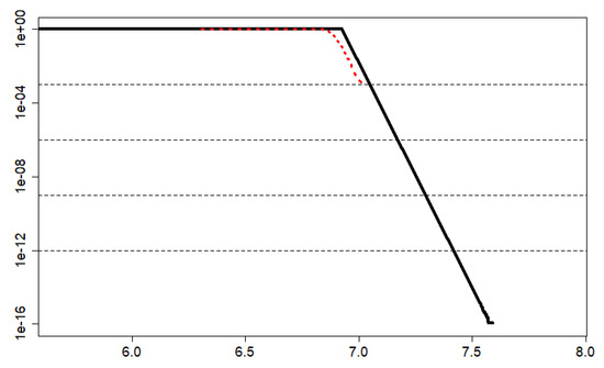 MBPTA in general, and MBPTA-CV in particular, builds upon Extreme Value Theory (EVT) [27,28], a branch of Statistics aiming at predicting rare events beyond those observed in an input sample. In the context of MBPTA, EVT is used to deliver a probabilistic WCET (pWCET) or, in other words, a distribution for high execution times so that the pWCET curve can be used to determine the probability of exceeding any particular execution time. Such pWCET curve is normally depicted as a Complementary Cumulative Distribution Function (CCDF), as the example shown in Figure 2, where the red dotted line corresponds to a sample of 1000 execution time measurements and the black straight line the pWCET curve. The y-axis corresponds to the exceedance probability (in logarithmic scale), and the x-axis shows execution time in seconds. For instance, we observe that the probability of exceeding an execution time of 7.4 s is up to per run.