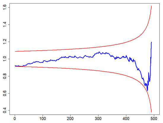 An example of a CV-plot is shown in Figure 3. The x-axis shows, for a sample of 1000 measurements, out of which the 500 lowest values are discarded, from left to right the number of exceedances discarded. For instance, when the x-axis indicates 400, it indicates that only the highest 100 values of the sample are retained, and the blue line indicates the estimated for those exceedances. The red lines include the range of values where the exponentiality assumption for the tail cannot be rejected with 95% confidence. If the blue line is below both red lines, then exponentiality is rejected and the tail is regarded as light. Hence, in this case using exponential tails is pessimistic but reliable for pWCET estimation. However, if the blue line is above both red lines, then exponentiality is rejected and the tail is regarded as heavy, thus meaning that exponential tails cannot be used. In the case of MBPTA-CV, the CV-plot is used to guarantee that the set of highest values used for pWCET estimation can be approximated with an exponential tail reliably.