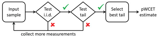 MBPTA-CV application process starts with the collection of an execution time sample. In the default application of the method, such sample must have at least 100 execution time measurements, although, in general, the larger the sample, the higher the chances to converge and deliver a pWCET estimate. Moreover, in general, larger samples have more information about the distribution and hence, pWCET estimates obtained will be tighter.