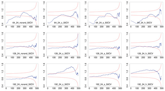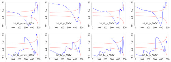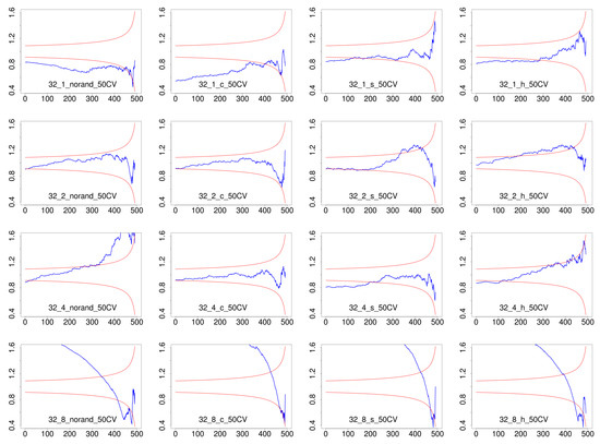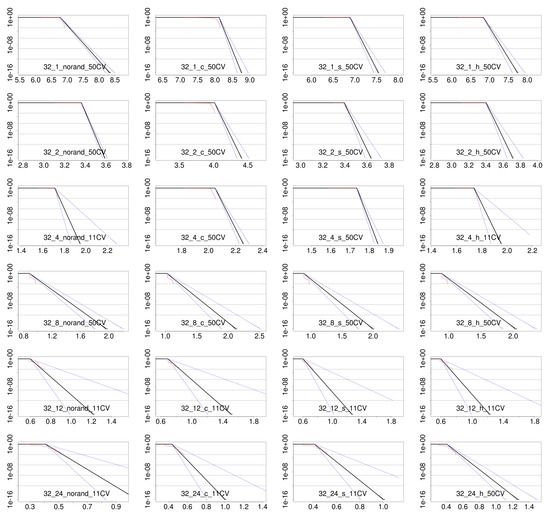 Together with pWCET estimates, we have obtained the CV-plot for each configuration as shown in Figure 7. For instance, the case for no randomization and 4 threads (third plot in first row) and no randomization and 12 threads (fifth plot in first row), have CV values in the region of heavy tails for 50 maxima (above the two red lines). However, when considering only 10 maxima, then the CV values are within the exponential range. Thus, for these two cases we obtained the pWCET distributions in Figure 6 imposing the use of at least 10 maxima instead of imposing the use of 50 maxima. In fact, out of the 24 cases in the figure, 9 of them where obtained with a limit of at least 10 maxima rather than at least 50, thus emphasizing the importance of relaxing this constraint for HPC systems.
