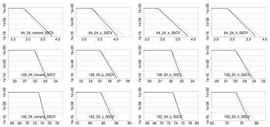 Analogous results have been obtained for other problem sizes, as shown in Figure 8. Problem sizes of 64 × 64 × 64, 128 × 128 × 128 and 192 × 192 × 192 are shown from top to bottom, for no randomization, code randomization, stack randomization and heap randomization from left to right. The corresponding CV-plots are also shown in Figure 9 for the sake of completeness. As shown, pWCET distributions accurately model tail distributions for high execution times. In these cases, at least 50 maxima could be used in all configurations. As before, code randomization introduces larger overheads than other types of randomizations, being in this case in the range 10–20% typically.