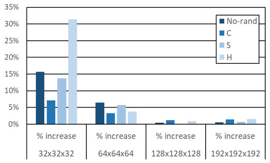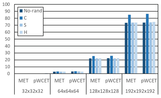 Finally, we show the absolute maximum execution time (MET) and pWCET estimates at an exceedance threshold of per run in Figure 10. As shown, absolute differences are small, thus showing that pWCET estimates are very close to the MET out of 1000 runs in absolute terms, which indicates that unobserved execution times can only be slightly higher than observed ones. Moreover, results show that stack and heap randomization cause little performance variation. However, code randomization causes a noticeable impact in MET and pWCET estimates, thus showing that code memory placement is particularly critical for this application. Relative results on the increase of the pWCET estimates w.r.t. MET are shown in Figure 11. As we increase problem size, execution time variability decreases in relative terms, which leads to sharper pWCET distributions and hence, smaller increase in relative terms of the pWCET estimates w.r.t. MET. Hence, the larger the problem size is, the more stable the execution time is. The use of SWrand along with MBPTA-CV provides strong guarantees on these observations, thus allowing an efficient use of resources scheduling HPC applications accounting for their unobserved high execution times.