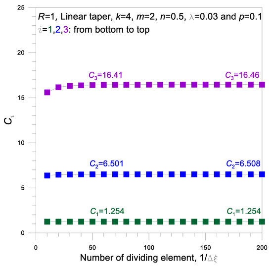 Prior to the numerical experiments, it is important to determine the suitable step size in the Runge-Kutta method for efficiently integrating efficiently differential Equation (34). To determine the appropriate , the convergence analysis was performed by the number of dividing column elements, , and its result is shown in Figure 2, where the input column parameters are presented. It has been observed that solutions of with converge to those with within three significant numbers. In this study, all computations with in the parametric study were carried out on a PC without any difficulties.