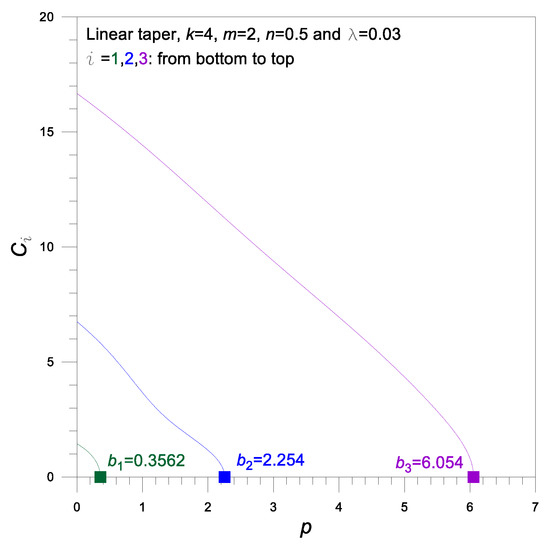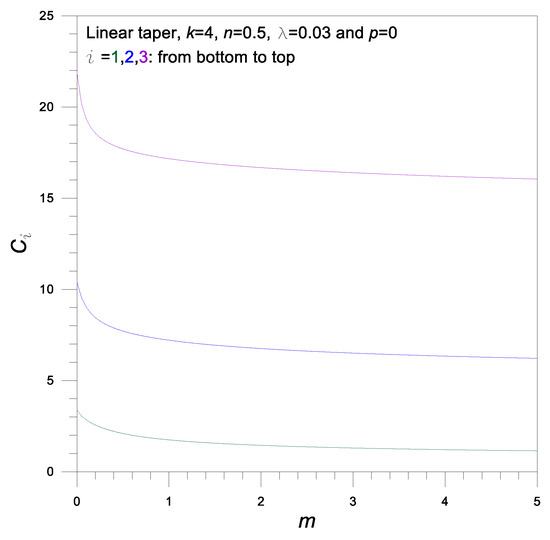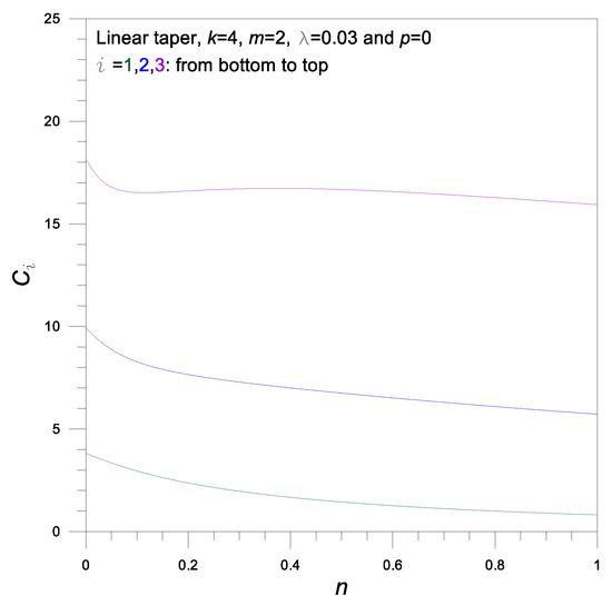 The effects of taper type on the frequency parameter , are shown in Table 5. The fundamental frequency parameter is larger in the order from the linear to sinusoidal to parabolic taper, while for the higher modes and , are larger in the order from the parabolic to sinusoidal to linear taper. As an illustrative example, of the linear taper is 5.6% (1.445/1.369 = 1.056) larger than of the parabolic taper and 2.2% (1.445/1.414 = 1.022) larger than of the sinusoidal taper. In higher modes, the effect of taper type may be negligible.