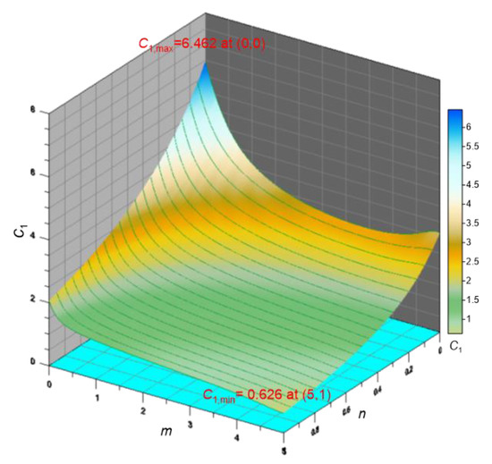 Figure 5 represents the three dimensional curved surface map of with respect to the fundamental frequency parameter in the domain of and for a given set of column parameters of the linear taper, , and , which is the same as previous Figure 3 and Figure 4. Figure 5 reflects the characteristics of both Figure 3 and Figure 4. The value decreases as both and values increase, and therefore the maximum value of occurs at the coordinates ,) and the smallest value of at the coordinates (, , as shown in this figure. If the values and are infinitely extended, i.e., zero flexural rigidity at the clamped end (), the value converges the minimum value of . This means that the cantilever column with the above given set of column parameters has the fundamental frequency parameters in the range of .
