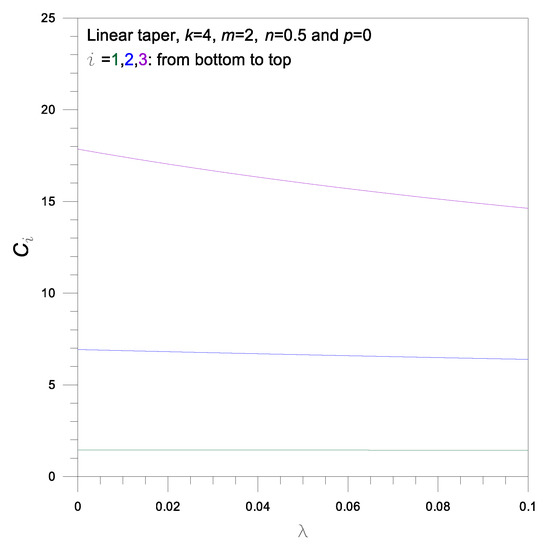 The numerical results for the modular ratio , taper ratio , volume ratio , and load parameter are presented in Figure 3, Figure 4, Figure 5, Figure 6, Figure 7 and Figure 8, where the effect of rotatory inertia is included. Note that column parameters used in the parametric study are presented in each figure.
