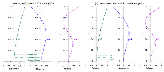 Now, consider the effects of column parameters on the vibration mode shapes. Figure 8 shows examples of the mode shapes for the given set of column parameters presented in this figure. In Figure 8a, three lowest () mode shapes for the linear, parabolic, and sinusoidal tapers are shown. In Figure 8b, those for are shown. Three mode shapes depicted by solid, dashed, and dotted curves, respectively, in Figure 8a,b, are much different from each other and therefore, the effects of the taper type and modular ratio on the mode shapes are significant. From these mode shapes, the positions of nodes and maximum amplitudes of the free vibrations are understood.