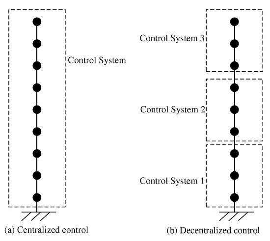 For controlling building structures, centralized strategies are often adopted. However, in a centralized mode, once the controller fails, the vibration displacement of the building structure may be large and cause cracking and even the collapse of the building. Decentralized strategies may be used to enhance the reliability of the control system and to mitigate the consequences of system failure [20,21,22]. A remarkable feature of a decentralized architecture is that there is no subordinate relationship among decentralized controllers in the system. Since each controller has its own target, the strategy for coordinating them effectively is an interesting and important issue.