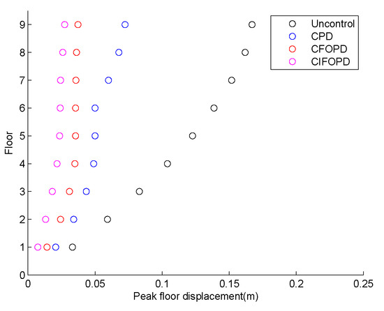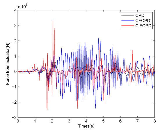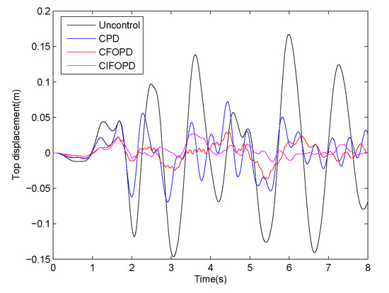 The displacement of the 9-floor building under centralized control is shown in Figure 5 and Figure 6. We verify that the CFOPD and CIFOPD yield acceptable performance, while the CPD leads to poor results. The maximum displacement obtained with the CFOPD is 0.0373 m and the average displacement given by (6) is m. For the CIFOPD, the maximum displacement is 0.0274 m and the average displacement is m. Therefore, the maximum displacement for the CIFOPD, when compared to the CFOPD, is reduced by 36.1% and the average displacement is reduced by 68.4%. The control signals of the CPD, CFOPID, and CIFOPID are shown in Figure 7. It follows that the CIFOPD is superior to the CFOPD.