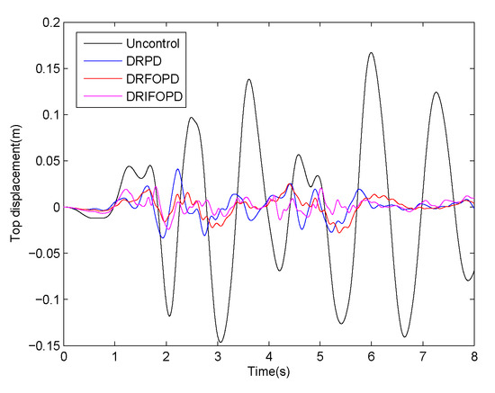 Figure 8 and Figure 9 depict the displacement of the 9-floor building structure under decentralized control. The maximum displacement obtained with the DRFOPD is 0.0279 m and the average displacement is m. The maximum displacement for the DRIFOPD is 0.024 m and the average displacement is m. Comparing both controllers, we verify that the maximum displacement obtained with the DRIFOPD is reduced by 16.3%, and the average displacement is reduced by 20.6%. The control signals of the DRPD, DRFOPD, and DRIFOPD are shown in Figure 10. We observe that the DRIFOPD is better than the DRFOPD.
