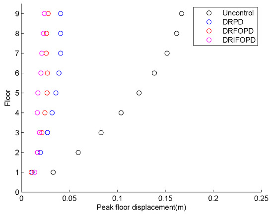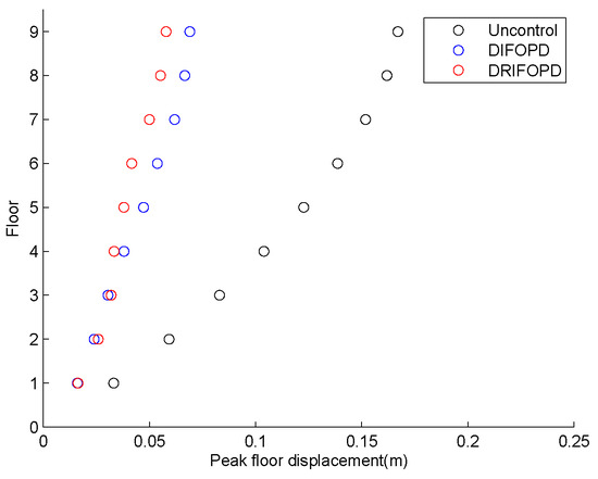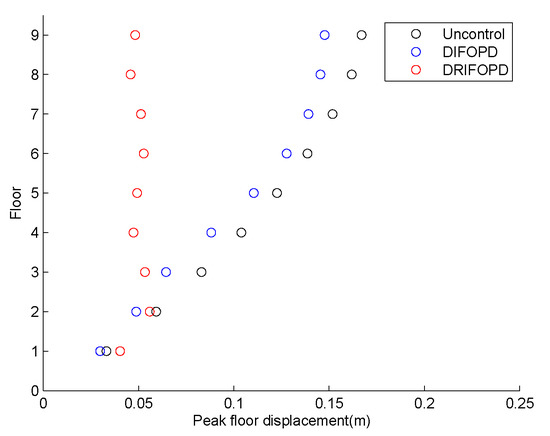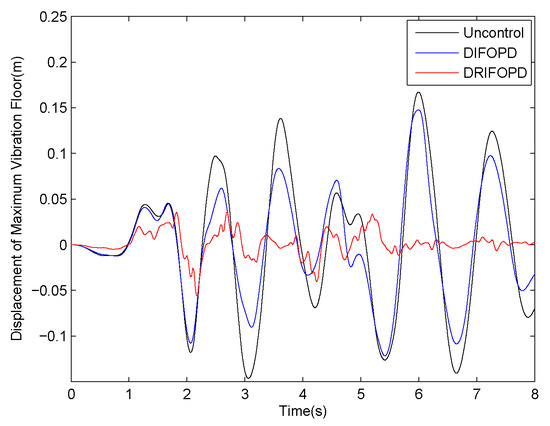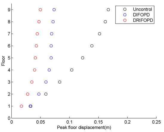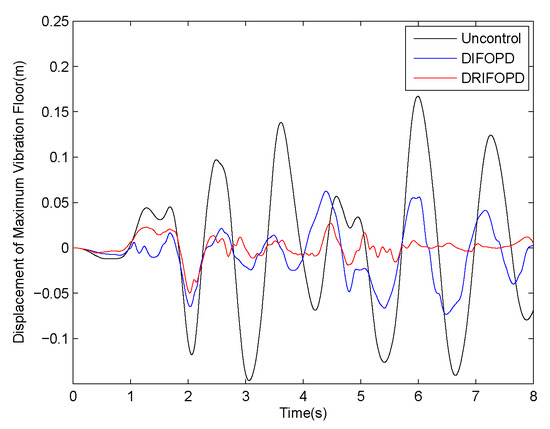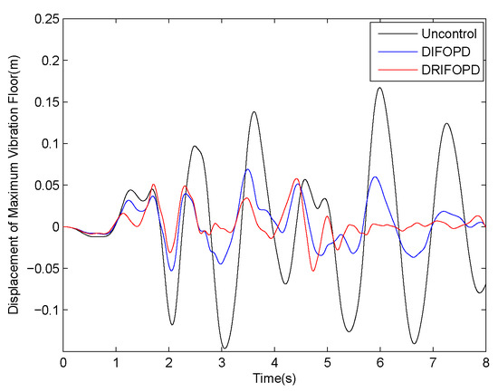 For the fault case 2, the displacement of the 9-floor building structure is shown in Figure 13 and Figure 14. The maximum displacement for the DIFOPD is 0.0691 m and the average displacement is m. The maximum displacement for the DRIFOPD is 0.0579 m and the average displacement is m. Compared with the DIFOPD, the maximum displacement for the DRIFOPD is reduced by 16.2%, and the average displacement is reduced by 79.4%. The results show that (i) both the DIFOPD and the DRIFOPD have some control action under fault case 2, and (ii) the DRIFOPD is better than the DIFOPD.
