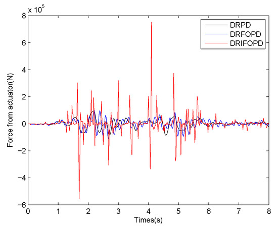 Forces output generated by the actuators under the action of the DRPD, DRFOPD, and DRIFOPD controllers.