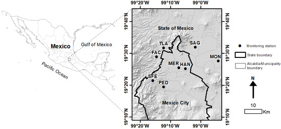 The Mexico City metropolitan area (MCMA) is one of the largest urban area of the world, with nearly million people distributed in about . The MCMA is composed by the Mexico City, 59 municipalities of the state of Mexico and one municipality of the state of Hidalgo. The MCMA is located within a raised basin at an average elevation of 2240 m surrounded by mountains to the east, south and west. The topography combined with meteorological phenomena modify pollutant dispersion pattern. The study area and the primary sampling sites located in FES Acatlán (FAC), Hangares (HAN), Merced (MER), Montecillo (MON), Pedregal (PED), San Agustín (SAG), Santa Fe (SFE) and Tlalnepantla (TLA) are shown in Figure 1.