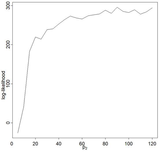 The performance of proposed model was evaluated through the simulation of a simple function which consists of two critical points where the function has a maximum and minimum, respectively. We simulated the data using the inverse transform method proposed by Ross [33] as follows: (1) we generated random values for and and obtained , and , using Equation (5); (2) we generated a random value q with uniform distribution and (3) simulated values were obtained through the inverse of the GEV distribution, given by the Equation (1), using the value of q obtained in step 2 and the values of , and obtained in step 1. Regarding the number of knots, we consider two settings, the first one using a set of basis functions with knots and the second with knots, in both cases we choose , , and . We can see in Figure 2, that the log-likelihood has stabilized at settings . Once the model was estimated, the estimates obtained for the shape parameter were −0.4000 and −0.4016, respectively. The estimate of the scale parameter was 0.1000 and 0.1002, respectively. The true functions of expressed as a function of the covariates and are shown in Figure 3a. The function corresponding to involves the sum of the exponentials to the square of the covariates and , which represents a nonlinear surface in the spatial plane, similar to the conditions in the extreme values that can occur in real situations of nonstationary extreme values. As expected, Figure 3c shows that the estimation improved by increasing the number of knots in the spline functions. The function for and are constant in the covariate space.