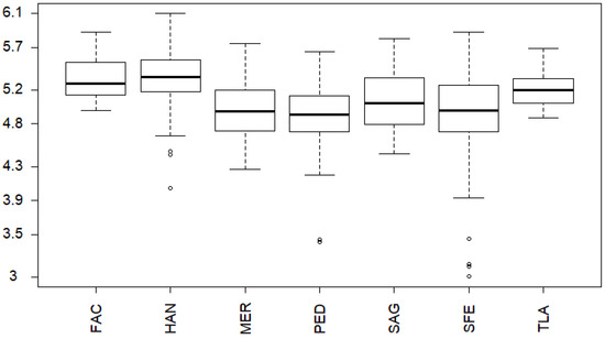 The descriptive statistics of the data by each monitoring station are shown in Table 1. On this table, we can see that there are differences in the distributions of the extreme values in each of the monitoring stations, i.e., the mean of the distributions is not constant. We verified these results in the boxplot presented in Figure 4. By a simple inspection of the descriptive statistics, we observed that the distribution of the extremes is not stationary, therefore the use of a nonstationary model of extreme values is justified for the analysis of trends. The inspection of Table 1 indicates that in station 1, located in the Acatlán area, the maximum intensity recorded was 6.09 W/m2, in contrast to the maximum intensity measured in station 5, located in the San Agustín area, located in the municipality of Ecatepec de Morelos, in the State of Mexico, where the maxima was 5.65 W/m2. Similarly, the station 3, located at the Merced and the station 7, located at Tlalnepantla, showed the lowest UVB radiation values in comparison with the other stations. Moreover, on these three stations where we observe more frequently intense periods of air pollution within the study region, the level of UVB radiation is lower than other less polluted areas in the MCMA.