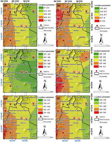 The estimates obtained for the and parameters were 0.2504 and −0.0356, respectively. The spatial smoothing for the years 2000, 2005, 2010, 2015, 2018 and 2019 for the location functions are shown in Figure 5. The results show well-defined patterns related to the trend in the spatial plane. The magnitude of the UVB radiation maxima decreased as we moved toward the east direction of the study area. This region coincides with the most industrialized areas of the MCMA. Therefore, these results indicate that the air pollution covariates reduce the net amount of UVB radiation that reaches the ground surface. In contrast, we observed that in the less polluted areas of MCMA there is a greater amount of UVB radiation. However, we were able to observe that, although the general trends are maintained throughout the study period, between 2010 and 2015 there was a small decrease in the intensity of UVB radiation in the central region, which return to the initial levels in 2018 and 2019. These results show that our model allowed us to identify the complete temporal dynamics of the trend throughout the study period. This is one of the strengths of the proposed model, which allows us to identify patterns in the distribution of maximum UVB radiation, make inferences and obtain conclusions about extreme values throughout the study region over time. The results also show the advantage of using a spline model with radial-based functions to estimate trends in extreme values. The nonlinear spatial function estimates in each of the different periods through a single model show the existence of the spatial variation of UVB radiation maxima. The proposed model also has the advantage that it includes the effects of covariate interactions in the model through the use of spline functions that depend on the norm of Euclidean distance between covariates and knots. This feature of the model combined with the penalty of the parameters results in a smooth continuous surface as shown in Figure 5. Future research could include the study of other types of distances between observations.