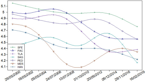 The results of the temporal trend of UVB radiation over the years keeping the other covariates constant are shown in Figure 6. In this figure, we can observe the existence of cyclic temporal patterns in the trends of the maxima in the regions located around the monitoring stations. An important finding related to the temporal behavior of the extremes, which can also be seen in Figure 6, is the decrease in the location parameter over time. An explanation for this finding could be the increase in pollution, specifically the amount of ozone (O3), nitrogen oxides (NOx), particles of 10 μm or less in diameter (PM10) and carbon monoxide (CO), which decreases the amount of UVB radiation as a result of direct chemical reactions or by radiation blockage.