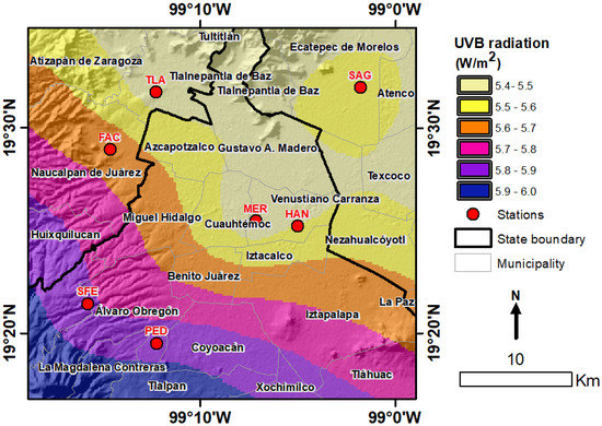 - Valdés-Barrón, M.; Bonifaz-Alfonzo, R.; Riveros-Rosas, D.; Velasco-Herreora, V.; Estévez-Pérez, H.; Peláez-Chávez, J.C. UVB solar radiation climatology for Mexico. Geofis. Int. 2013, 52, 31–42. [Google Scholar] [CrossRef][Green Version]