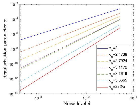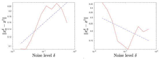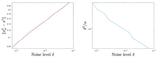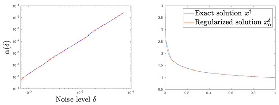 Obviously, the a priori parameter choice expressed in Equation (19) satisfies the sufficient condition expressed in Equation (10) for the convergence of regularized solutions from Theorem 1. More precisely, taking into account Example 1, the choice expressed in Equation (19) has the form of Equation (11) with , which for yields and belongs to Case (iii), where the quotient tends toward infinity as . We mention that the choice expressed in Equation (19) coincides with the choice in [8] suggested by Natterer, who proved the order optimal convergence rate expressed in Equation (20) for linear ill-posed operator equations. For the nonlinear operator expressed in Equation (1), in [3], the convergence rate expressed in Equation (20) has also been proven for the a posteriori parameter choice from Equation (5). However, by now, there are no analytical results about the -asymptotics of the discrepancy principle as tends toward zero. The numerical experiments in the subsequent sections will provide some hints that the hypothesis does not have to be rejected.