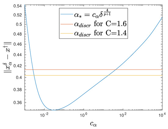 which approximates from Equation (5). Unless otherwise noted, C = 1.3 was used. From the case studies in [10], we can conjecture, but have no stringent proof, that the -rate of the discrepancy principle does not systematically deviate from the a priori rate expressed in Equation (19), which for attains the form