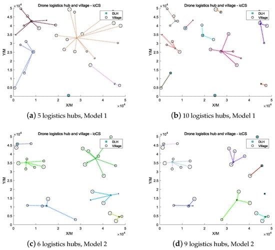 In the formula, represents the straight line distance from the center of the village labeled i to the nearest logistics hub. is the distance between a village and a logistics hub minus the village radius, as drone delivery is not delivered to the precise location of the recipient, but is delivered to the edge of the village, which can ensure better security. N is the total number of villages to be considered. is the number of people living in the village. The larger is the population, the more frequently does the logistics center deliver to the village, thus the logistics hub needs to be closer to the village to reduce the overall cost. is the distance for land transportation, is the distance for linear delivery using drones, and is usually a value greater than 1, thus the logistics hub needs to be closer to villages with high land distribution costs. The variables and parameters involved in the model can be obtained through actual measurement. There are no unnatural parameters, and the degree of traffic difficulty is also obtained by using land transportation distance and straight flight distance. All parameters can be calculated from the application environment data during actual application.The solution obtained after calculating the model is the relative positions of multiple logistics hubs, and different villages choose their nearest logistics hubs based on the distance. In the end, different solutions will be generated according to the number of logistics hubs. Because the proposed model does not take into account all the influencing factors, and the importance of the model’s constraints is different in different situations, it needs to be artificially selected according to actual conditions.