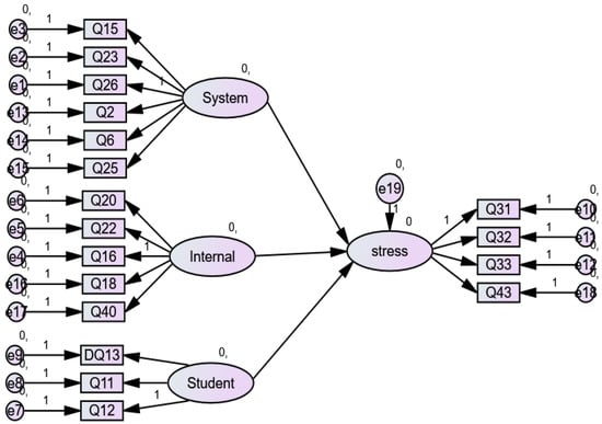 The theoretical causal model is presented in Figure 2. The causal model consists of three latent exogenous variables, School system (SYSTEM), Teacher internal characteristic (INTERNAL), Students (STUDENT), and stress as a dependent variable. The dependent variable stress is directly affected by the latent exogenous variables. SYSTEM is symbolized by F1 and is measured by six variables: Q2, Q6, Q15, Q23, Q25, and Q26. INTERNAL is symbolized by F2 and is measured by five variables: Q16, Q18, Q20, Q22, and Q40. STUDENT is symbolized by three indicator variables: Q11, Q12, and Q13. Stress is symbolized by four variables: Q31, Q32, Q33, and Q43. These variables are presented in Table 1 and included in the causation model after performing the Confirmatory Factor Analysis (CFA), where “1” indicates a standardized value of a theoretical causation model and “0” indicates the residual of the theoretical causation model.