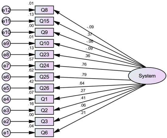 Table 3 presents the standardized direct effects of SYSTEM. Table 4 shows the model estimation and significance of confirmatory factor analysis for SYSTEM. The null hypotheses in confirmatory factor analysis all the variables are not confirmed for the latent factor “SYSTEM”. Since some p-values in the table are greater than α = 0.05 (fixed level of significance), only the variables Q3, Q8, Q9, and Q10 do not confirm the latent factor “INTERNAL” and the other variables Q2, Q6, Q15, Q23, Q24, Q25, and Q26 are statistically significant.