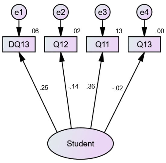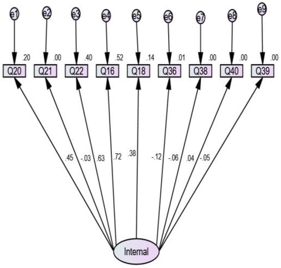 Table 6 shows the model estimation and significance of CFA for INTERNAL. The null hypotheses in CFA are all the variables are not confirmed for the latent factor “INTERNAL”. Since some p-values in the table are less than α = 0.05 (fixed level of significance), only the variables Q20, Q22, Q16, Q18, and Q40 confirm the latent factor “INTERNAL”. Table 7 shows the standardized direct effects of STUDENT.