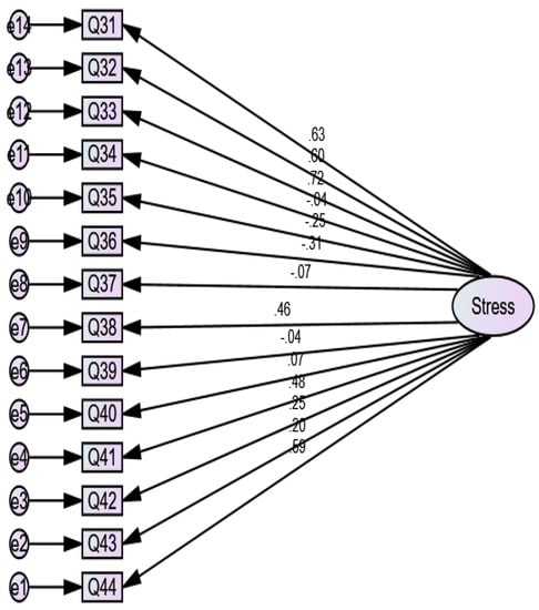 Standardized direct effects of STRESS are presented in Table 9. The model estimation and significance of confirmatory factor analysis for STRESS is given in Table 10. The null hypotheses in CFA are all the variables are not confirmed for the latent factor “STRESS”. Since some of the p-values in the above table are greater than α = 0.05 (fixed level of significance), the variables Q34, Q37, Q39, and Q40 do not confirm the latent factor “STRESS” and the other variables Q31, Q32, Q33, Q35, Q36, Q38, Q42, Q43, and Q44 are a statistically significant level at 0.05.
