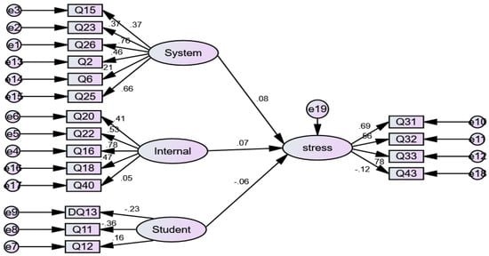 Table 12 shows that the measurement model of the causal structure is established through causation modelling. At the 5% level of significance, our model exhibits good fit and concluded that SYSTEM, INTERNAL, and STUDENT factors of stress have an influence on the stress level of public and private primary school female teachers. We use other common fit indices to evaluate the goodness of fit of the model. The absolute fit indices, such as chi-square, RMSEA, RMR, GFI, and AGFI outcomes, show a reasonable fit of the causal model of stress. The outcome of incremental indices NFI and CFI are close to their suggested values.