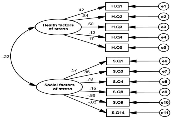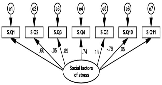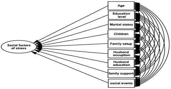 In the first measurement model (i.e., social factors of stress), the latent structure in Figure 14 was established through SEM. AMOS was utilized to estimate the parameters and model fit, using a sample covariance matrix as input and the maximum likelihood function. Standardized estimates of social factors of stress show that marital status, age, and number of children have a strong correlation with stress. These factors cause stress in primary school female teachers. Table 15 shows that the husband’s occupation and family support have negative correlations.