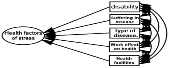 In the second measurement model (i.e., health and social factors of stress), the latent structure in Figure 16 was established through SEM. AMOS is utilized to estimate the parameter the model fit is obtained by using a sample covariance matrix as input and maximum likelihood function. The standardized estimates of health and social factors of stress show that the marital status, age, suffering from disease, and disease type have strong correlations with stress; these factors cause stress of primary school female teachers. Table 17 shows that the husband’s education level, teaching performance, and health facilities for teachers have negative correlations in the model of health and social factors of stress.