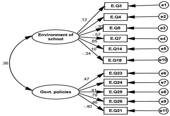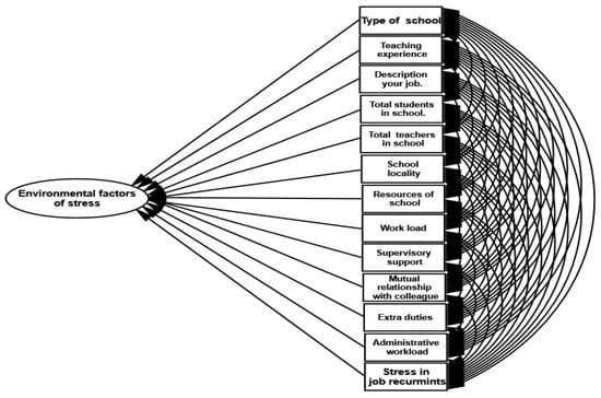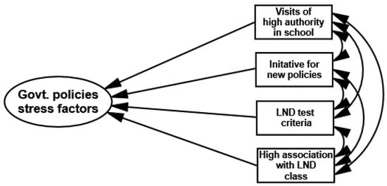 In the third measurement model demonstrating government policies and environmental factors of stress, the latent structure in Figure 16 was established through structural equation modelling. AMOS is employed to estimate the parameter and model fit using a sample covariance matrix as input and the maximum likelihood function. The standardized estimates of government policies and environmental factors of stress show that the school locality, additional administrative duties, new emphasis on literacy and numeracy drive (LND), and high degree of association with LND classes have correlations with environmental stress. These factors cause stress in primary school female teachers. Table 20 shows that the number of students and teachers in school, the school head’s behavior, and student’s misbehavior in class has negative relationships in the model of government policies and environmental factors of stress.
