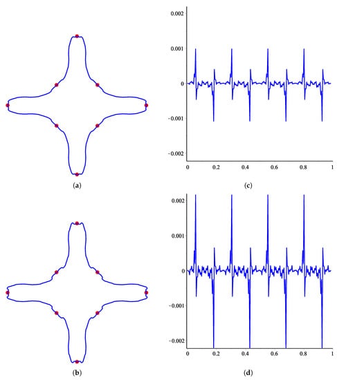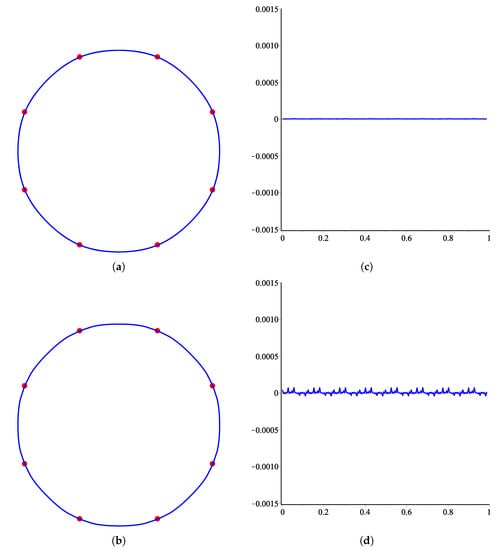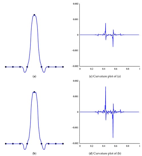 The quality of SS can be measured quantitatively by finding curvature, as functions of cumulative chord length. We use the method described in Reference [] to determine the curvature and numerical simulations are provided to illustrate the effects of various choices of shape parameter on curvature. Since the -scheme is parametric, it is obvious to see the results for various choices of the parameter u. Here we measure the curvature of limit curves of the -scheme for various choices of u. In Figure 1 and Figure 2, we consider a control polygon of a circle. The shape of the circle is obtained by applying an -scheme five times on this initial control polygon for various choices of parameter u. These limit curves are shown in Figure 1a,b and Figure 2a,b, while their corresponding curvatures are shown in Figure 1c,d and Figure 2c,d. In Figure 3 and Figure 4, we consider a star-shaped closed control polygon. The limit curves after applying the -scheme five times on this initial control polygon for various choices of parameter u is shown in Figure 3a,b and Figure 4a,b, while their corresponding curvatures are shown in Figure 1c,d and Figure 2c,d. In Figure 5 and Figure 6, we consider an open control polygon that presents the basic limit function of the scheme. The limit curves after applying the -scheme five times on this initial control polygon for various choices of parameter u is shown in Figure 5a,b and Figure 6a,b, while their corresponding curvatures are shown in Figure 5c,d and Figure 6c,d.