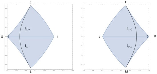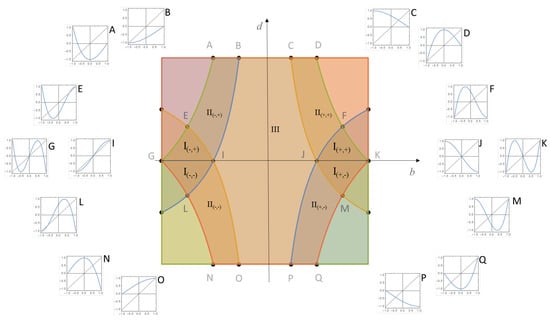where is distinguishing the signs of the parameters . The region has not the signs of the parameters discriminated since its behavior is very simple and direct. The regions which compose correspond to the cases in which both the critical points are in the interval and its orbits contained also in . The chaotic behavior region is contained in . Note that the region is disconnected according to the sign of b, that is, its connected components are and .