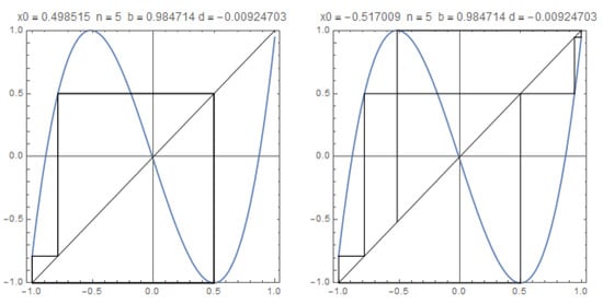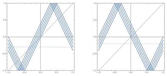 General bimodal maps, which are continuous maps with two critical points, are characterized by two parameters, up to topological conjugacy. In an equivalent way, they are characterized by two symbolic sequences called kneading sequences, corresponding to the symbolic itineraries of the critical points, see Reference [] for details, and below for the definition. Assuming the conditions referred in the previous section: isotropic motion, rest position as a possible solution and the simplest situation in which we have one attractor or two symmetrical attractors, we arrive to a family of interval maps which are symmetric and bimodal, that is, differentiable with two critical points, and . This family is topologically equivalent, through conjugation of an interval homeomorphism, to a one-parameter family of the interval . The simplest case possible, in terms of analytical expression, is a symmetric cubic map