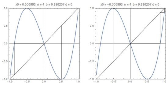 In the symmetric case, , it is useful the notation , , , , , to express the symmetry of the admissible sequences. In particular, for any we have . In general, there are two distinct critical orbits , in this case necessarily, (two symmetrical atractors). Nevertheless, we may have one critical orbit, that is, the two critical points belong to the same orbit (one atractor), and in this case the kneading sequences must be periodic and , where t is the period.