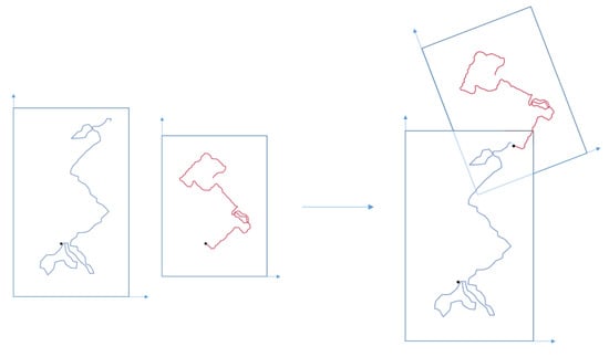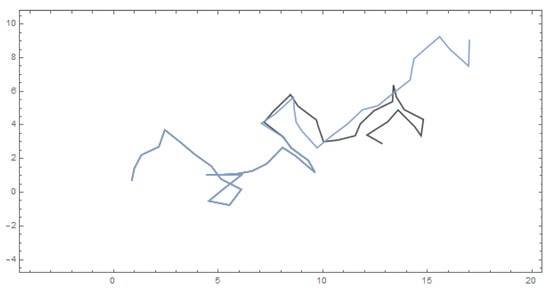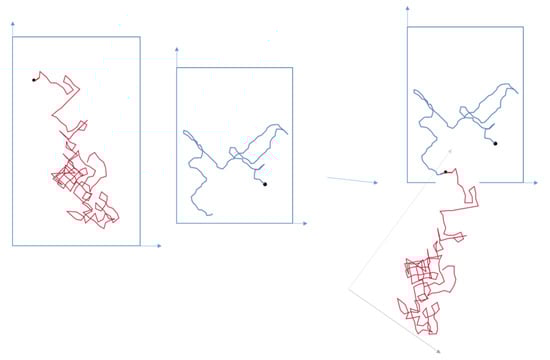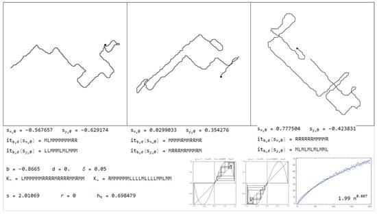 The uncertainty at the theoretical level, with respect to the initial conditions, influences the difference in the produced trajectories for the same behavior, organism or physical conditions. That is, a small perturbation of the initial conditions , , corresponds to perturbing a given trajectory, as in Figure 6, obtaining different runs of the same organism, for example. This allows the simulation of the movement of particular organisms in particular physical conditions, choosing different initial conditions for the same set of parameters. The uncertainty with respect to small perturbation of the parameters , depending on the parameter region, can influence deeply the behavior or the physical conditions for a given organism. This is typical for chaotic systems and can be observed in some of the dictionary entries in Section 6. Regarding uncertainty of experimental data, the relevant concept is the critical sequences of lengths, in each Cartesian coordinate, associated with the maximal lengths observed. These sequences constitute the kneading invariant. The important point is to identify how the consecutive observed lengths organize themselves with respect to the critical lengths, that is, if are larger (symbol R), smaller (symbol L) or between the two critical lengths (symbol M). The symbolic dynamics is robust to uncertainty regarding individual length measurements. However, regarding the choice of the sample points, see for example Figure 9, and the choice of the turning points of the rotation in the Cartesian frame, from an empirical trajectory, some work must be done to decide if the obtained results are somehow independent on sampling method or if it is necessary to develop a canonical sampling procedure adapted to the model.