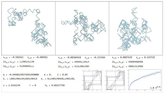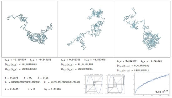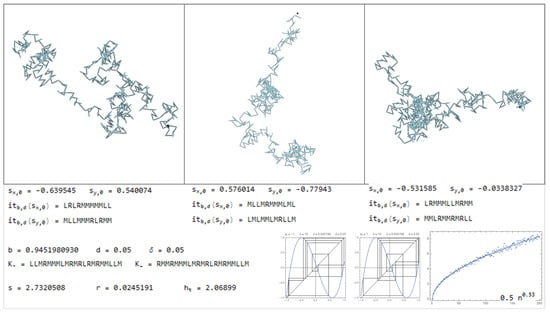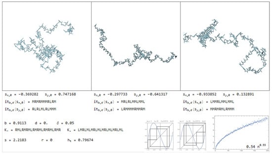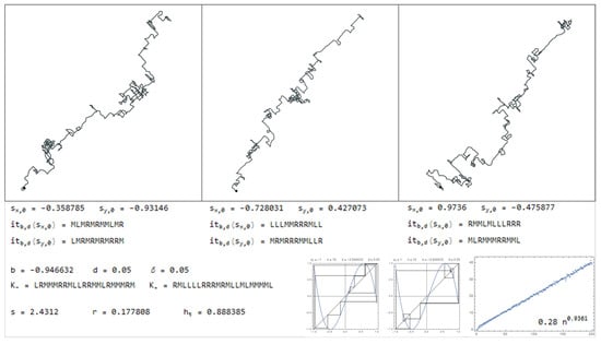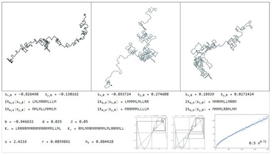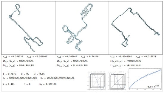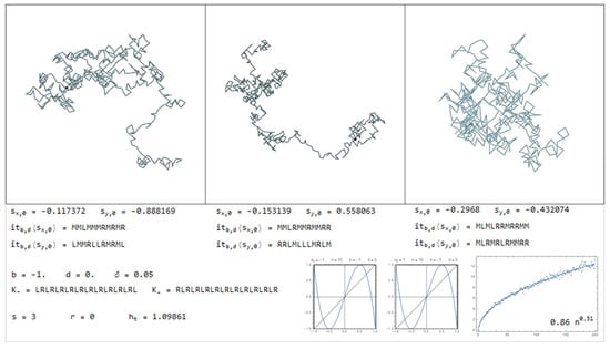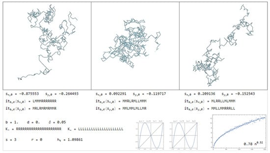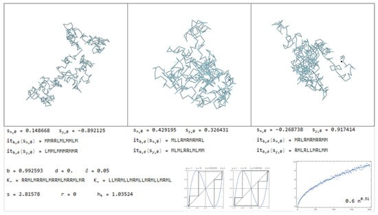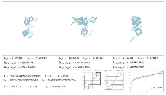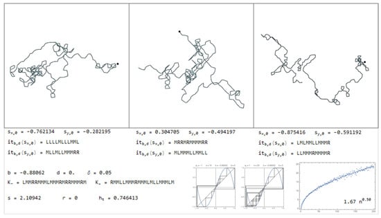 The values of the parameters are presented together with the corresponding kneading sequences. For each pair, , are shown three different simulations, with the initial conditions , chosen randomly. Note that due to the sensitivity to the initial conditions, in particular for high topological entropy, the trajectories change significantly with a very slight change in the initial conditions. In Figure 11, Figure 12, Figure 13, Figure 14, Figure 15 and Figure 16, are represented trajectories with positive b and . In Figure 17, Figure 18, Figure 19, Figure 20, Figure 21, Figure 22 and Figure 23, are represented trajectories with negative b and . In Figure 24 and Figure 25 both the parameters are positive and in Figure 26 and Figure 27 the parameter b is negative and d is positive. The topological invariants are also presented, such as growth number s, the r-invariant and the topological entropy. Two graphics of the trajectories of the critical points, under the map are presented, to illustrate the global behavior of the produced displacements. Finally, a simulation which determine approximately the quadratic mean displacement. This shows that for different values of the parameters the behavior, in average, may be comparable to the random walk, that is, diffusive behavior with the exponent close to . This is the case in Figure 11, Figure 12 and Figure 13 and Figure 15, for example. There occurs superdiffusive behavior with exponent larger than and below 1, for example in Figure 16, Figure 23 and Figure 24. The sub-diffusive behavior appears with the exponent less than . This is usually associated to parameters producing atractive orbits close to periodic orbits which have no zero average, producing a slow drift, although d may be 0. For an example of this phenomena see Figure 19 and Figure 21. Naturally, there are values of the parameters where the displacement is quasilinear. In this case, it is an almost direct trajectory with low (or 0) topological entropy.