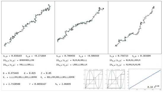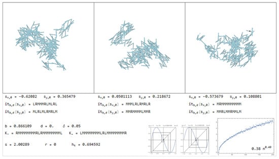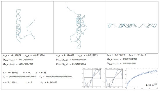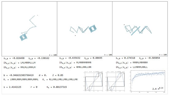 - Different types of coordinates can be considered, using the above assumptions. We have tested polar coordinates and coupled Cartesian coordinates. However, in the present paper, as in Reference [], we focus on Cartesian uncoupled coordinates. A general framework using matricial iteration is very promising and will be used in forthcoming paper. There are several reasons to focus, on a first approach, on the very simple iterated maps with uncoupled Cartesian coordinates: (1) its symbolic dynamics is well known, (2) the two or three dimensional trajectories can be reduced to one dimensional dynamics (3) the complexity of trajectories obtained is sufficiently interesting and varied to be analyzed.